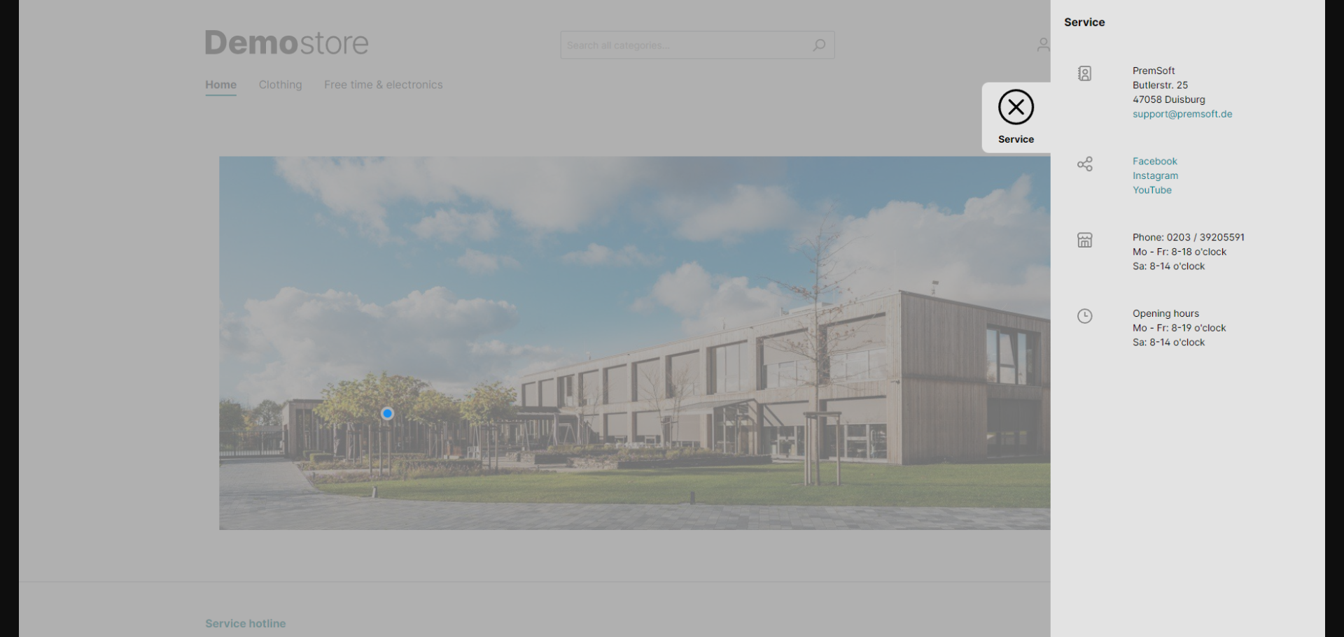 Die Service App bietet die Möglichkeit einen Service Badge im Shop anzuzeigen. Bei Klick auf den Badge öffnet sich ein Layer mit dem du Informationen wie: Kontakt Daten, Öffnungszeiten, Social Media Verlinkungen usw. einbinden kannst.