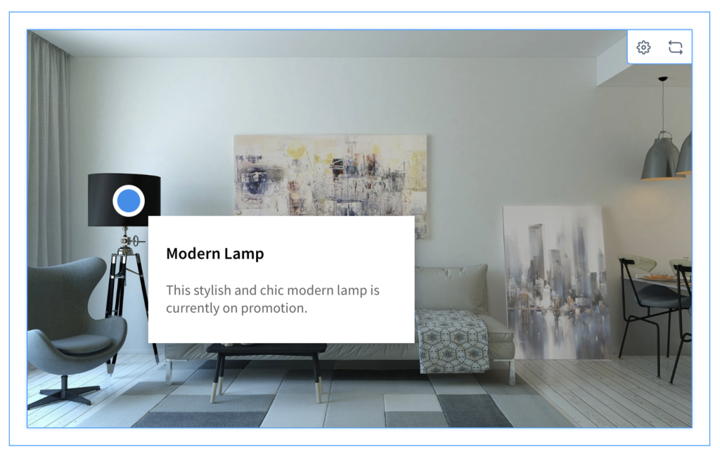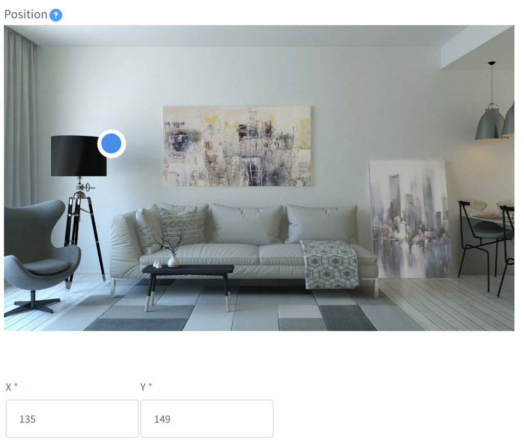 The hotspot position is the location of the clickable element that the user interacts with. By default, it is shown as a blue and white circle against your main image, however the appearance is fully customizable.