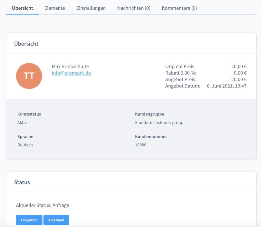 Die Seite Übersicht/Status bietet eine Zusammenfassung der ausgewählten Angebotsanfrage.